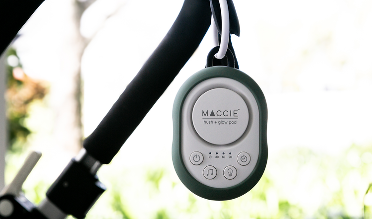 The MACCIE hush + glow pod is a portable white & brown noise sound machine with a dimmable night light designed to help create a peaceful sleeping environment for babies at home or while travelling.