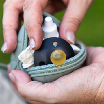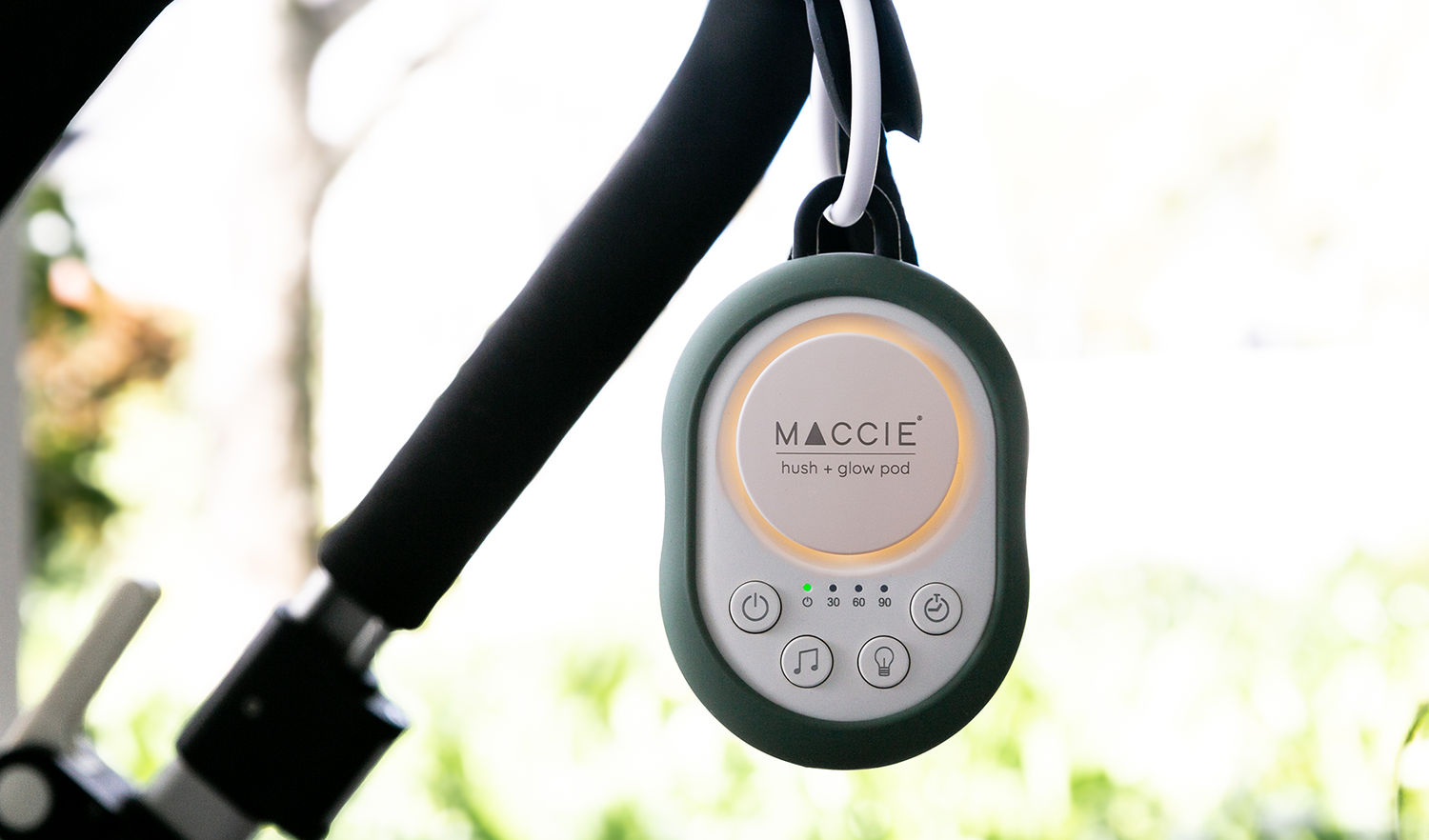 The MACCIE hush + glow pod is a portable white & brown noise sound machine with a dimmable night light designed to help create a peaceful sleeping environment for babies at home or while travelling.