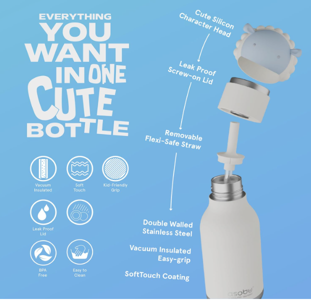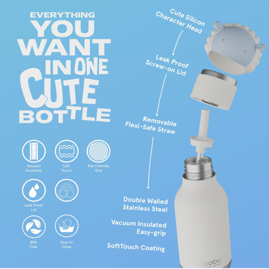 - Leakproof lid with a fun, removable character head