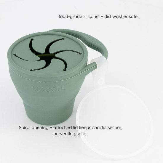 Specially designed for little hands and curious minds, the soft spiral opening allows little hands to reach into the cup and grab snacks without the mess- keeps crumbs contained, saving moms (and dads!) precious time and effort on clean-up.