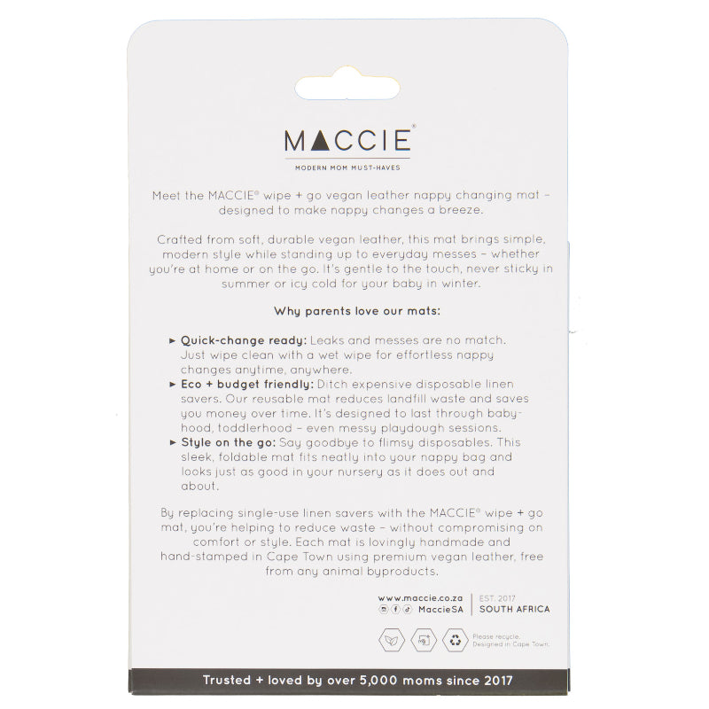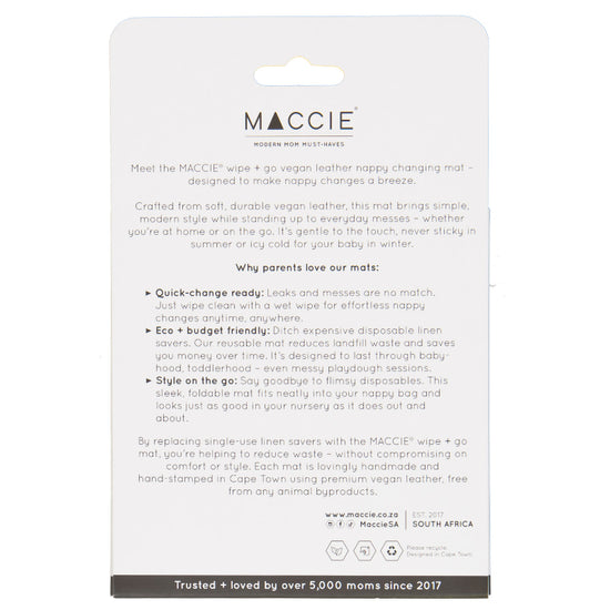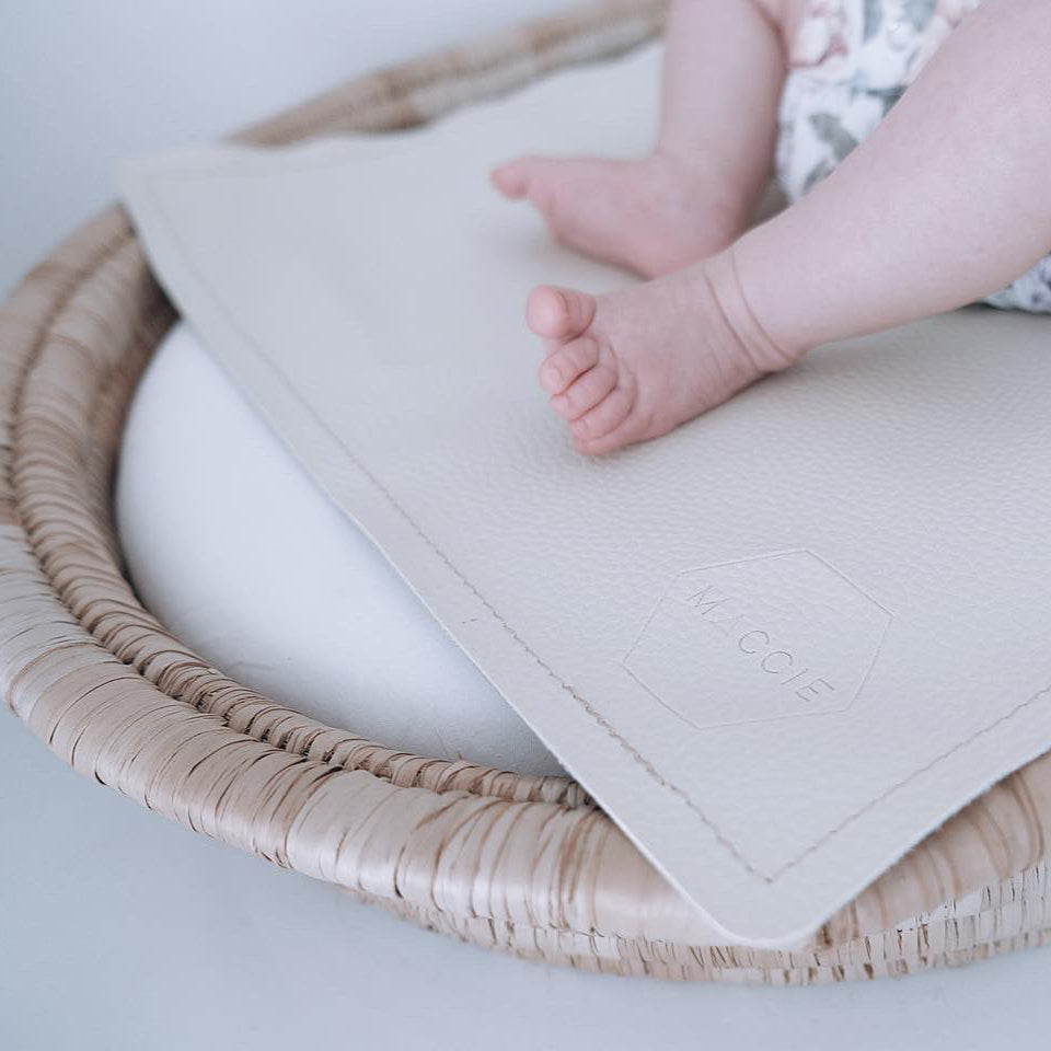 Made from soft and durable vegan leather, MACCIE baby changing mats are both stylish and practical. Ideal for home changing stations or on-the-go, MACCIE baby changing mats are water resistant and wipeable - clean any mishaps with a damp cloth or wet wipe.
